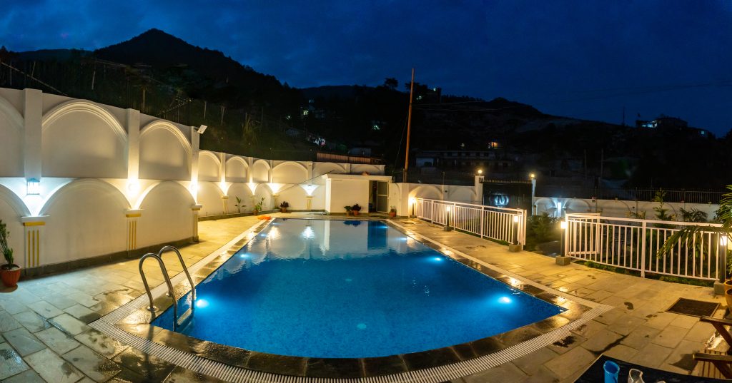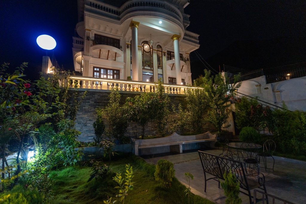 Book the entire White House Villa, 8 bedrooms, private pool, garden terraces, for your group retreat in Nepal.